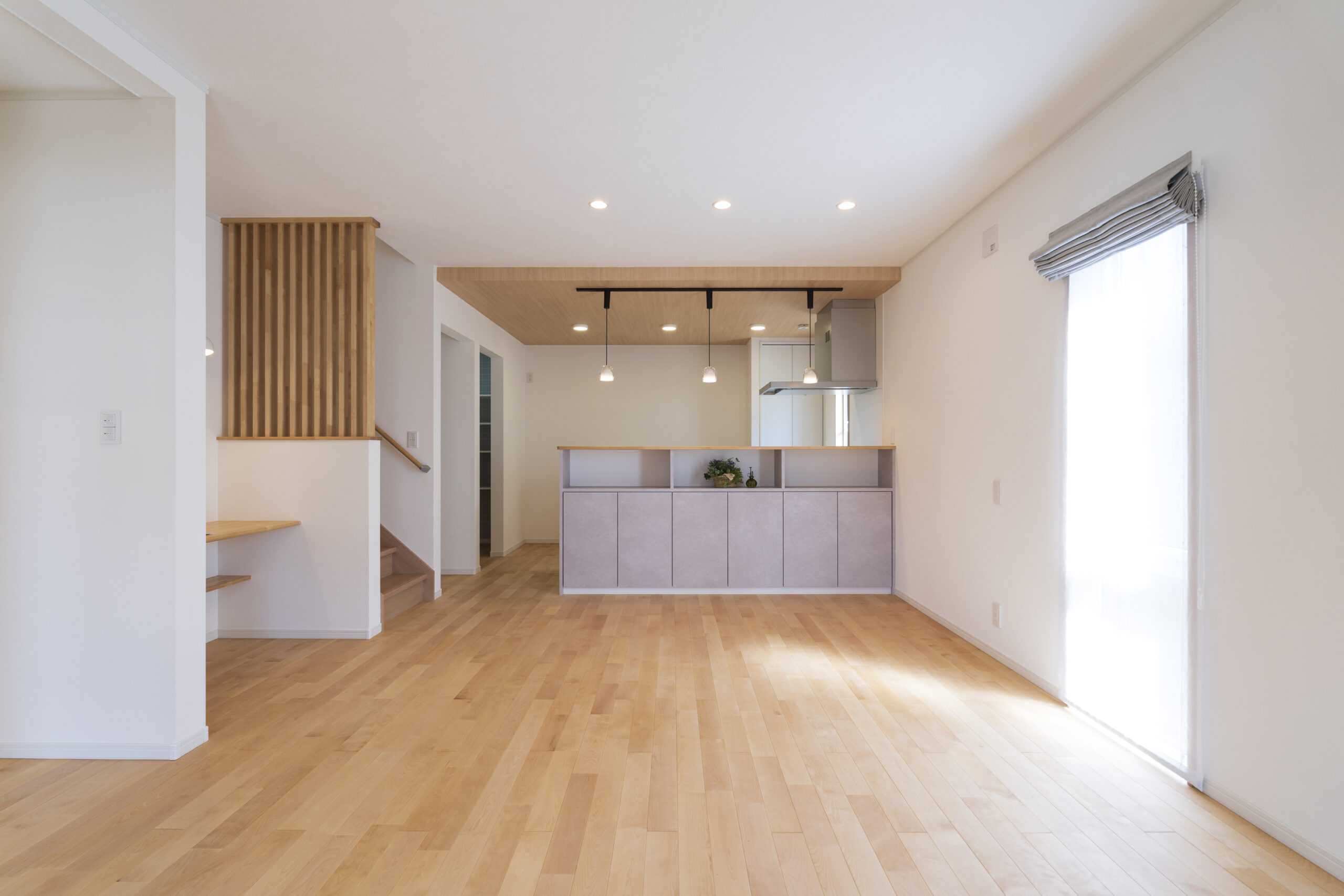 取り込んだ光をより効果的に活かすには、内装の色選びも大切。壁は白を基調に、床はカバザクラなどの明るいトーンでまとめると、光を反射して空間全体が広く感じられます。