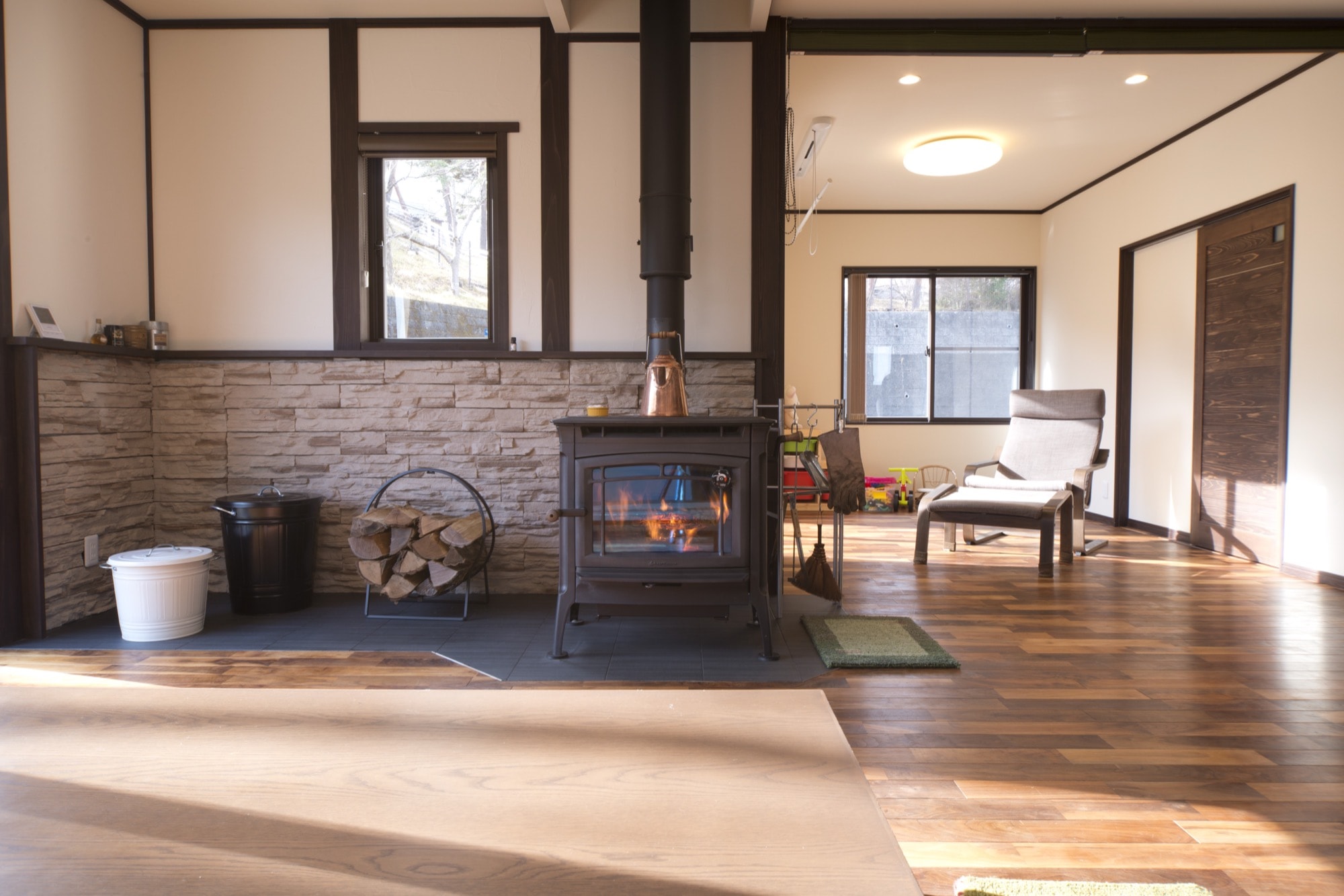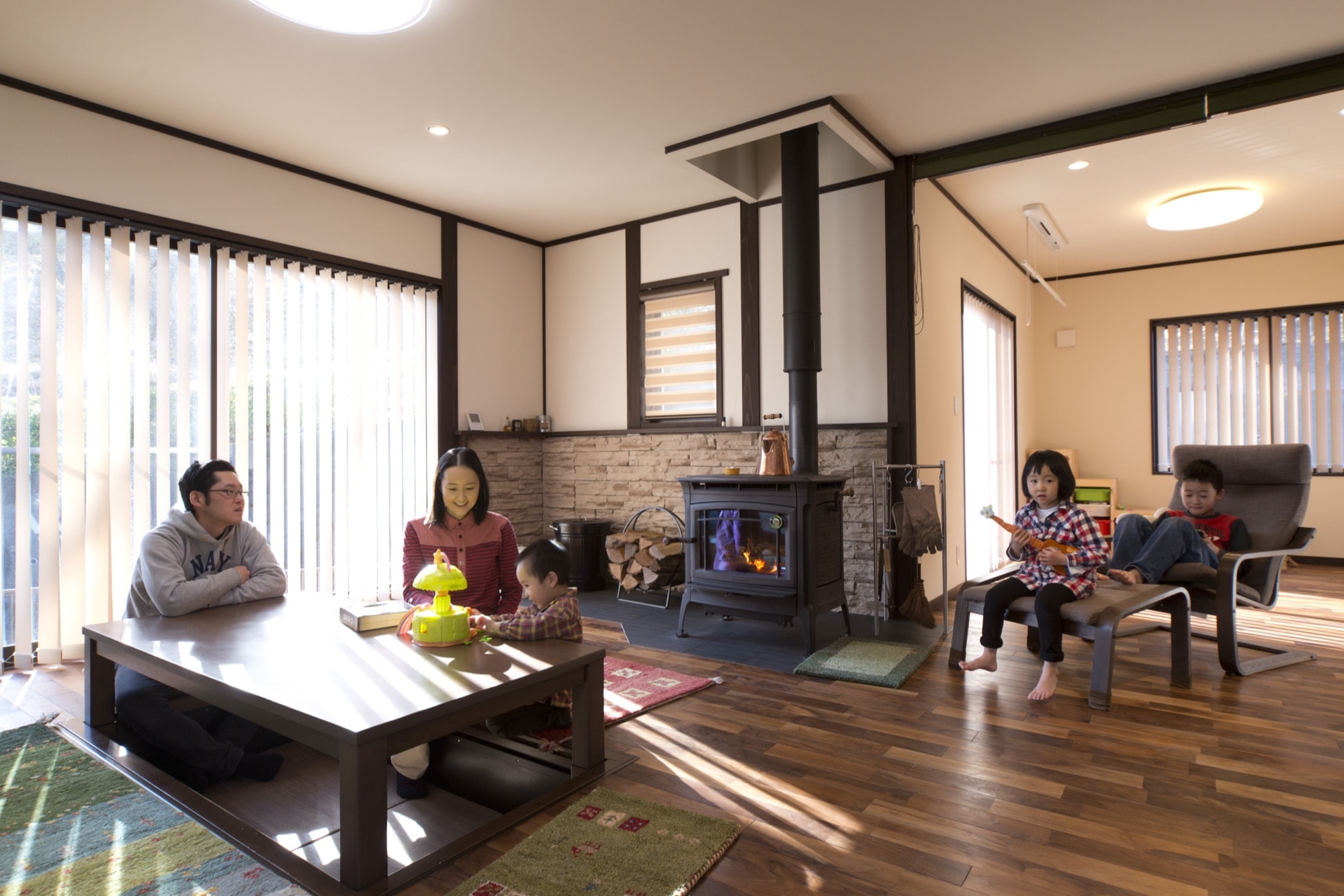 薪ストーブを中心に、家族が自然と集う無垢の家