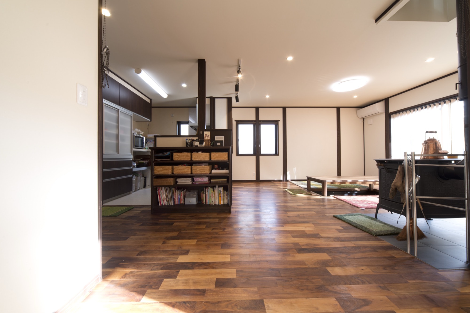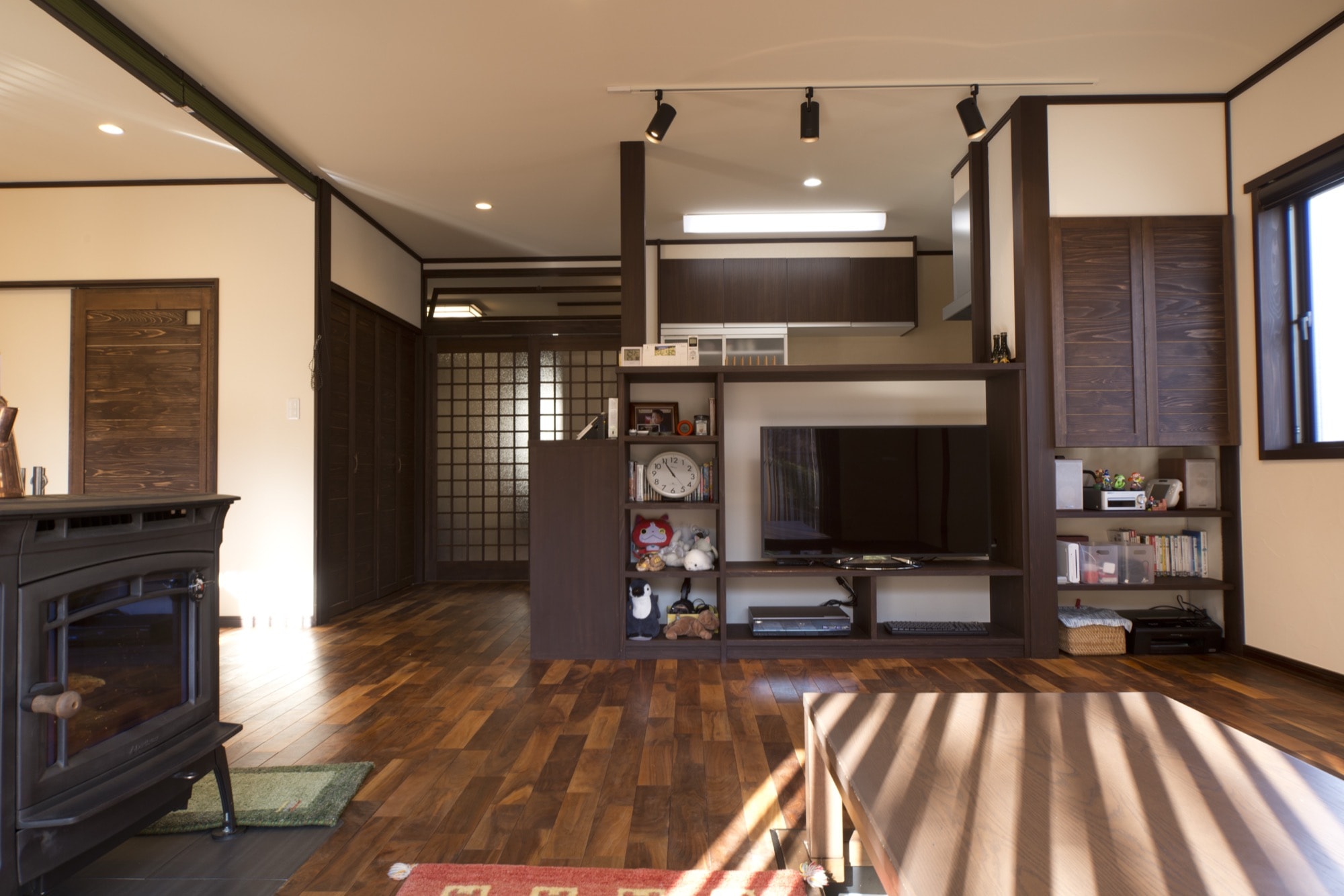 住まいの中心には、当初からご要望があった薪ストーブを配置。熱効率にも配慮し、2階へ暖気が流れるよう煙突まわりの空間を確保し、LDK入口の建具上部には造作の通気窓も設けました。掘りごたつのあるリビングでは、炎を眺めながら家族が自然と集う時間が生まれます。