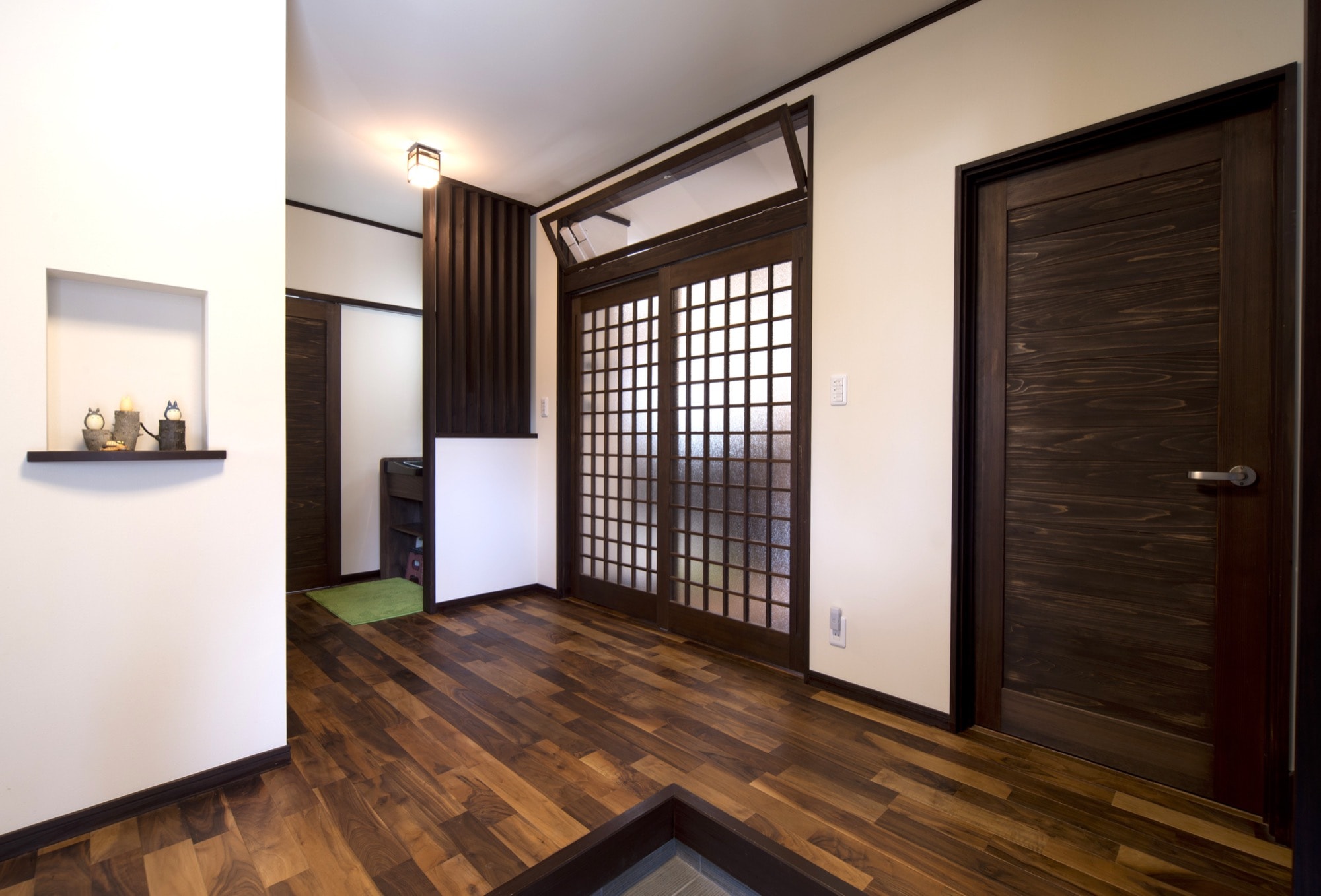 床材には無垢のブラックウォールナットを採用。塗装や表情の異なるサンプルを比較し、木の豊かな風合いが感じられるものを選定しました。1階は真壁づくり(柱や梁などの構造体を見せるつくり)や造作建具を取り入れ、古民家のような落ち着きを演出しています。